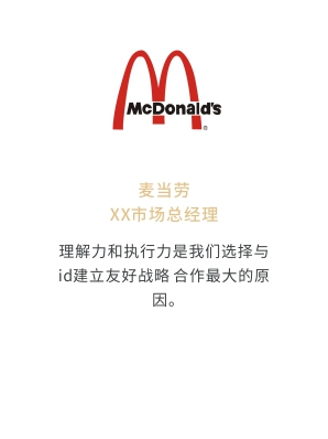 i-d先后經歷與Audi、Mercedes-Benz、infiniti、PORSCHE、可口可樂、麥當勞、肯德基、Budweiser、華為、小米、中國移動、ELLE、L'OREAL、萬達、仁恒置地、恒大、碧桂園、蘭桂坊...的業務合作,成功地將國際化的營銷策劃理念及執行方式融入本土,為更多的中國企業開啟全新的品牌推廣思路和執行方案。
